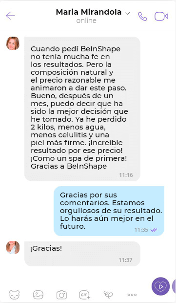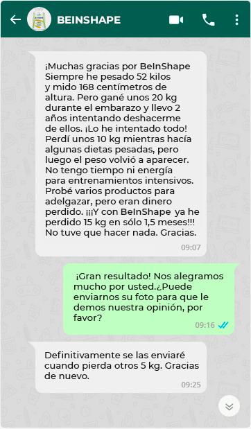 Miembro de la sociedad de nutricionistas con 12 años de experiencia.- Cuántas veces me he encontrado con las horribles consecuencias del uso inadecuado de diversos medicamentos no probados por parte de jóvenes y mujeres. En la lucha por conseguir una figura bella y delgada, la gente toma irresponsablemente pastillas para reducir el apetito, quemar grasa o aumentar la energía. Cuando empiezan a sufrir problemas de salud, vuelven a engordar cuando termina el tratamiento. Recomiendo BeInShape como un producto seguro y eficaz.